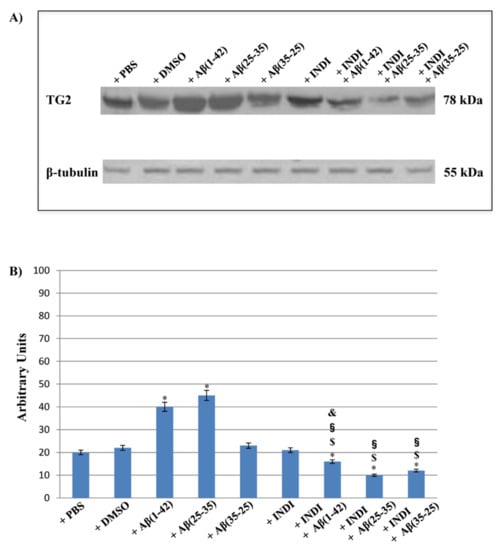 Western blotting analysis. (A) Representative immunoblot for total tissue transglutaminase (TG2) expression levels in total cellular lysates from OECs in different conditions: control, DMSO, 100 µM indicaxanthin (INDI), 10 μM Aβ(1-42) or Aβ(25-35) or Aβ(35-25) both in the absence and presence of 100 µM INDI for 24 h. (B) Densitometric analysis of TG2 expression levels performed after normalization with β-tubulin. The results are expressed as the mean ± S.D. of the values of five separate experiments performed in triplicate. * p < 0.05 significant differences vs. controls; $ p < 0.05 significant differences of Aβ(1-42) + INDI or Aβ(25-35) + INDI or Aβ(35-25) + INDI vs. INDI; § p < 0.05 significant differences of Aβ(1-42) + INDI vs. Aβ(1-42), Aβ(25-35) + INDI vs. Aβ(25-35) or Aβ(35-25) + INDI vs. Aβ(35-25); & p < 0.05 significant differences of Aβ(1-42) + INDI vs. Aβ(25-35) + INDI or vs. Aβ(35-25) + INDI.