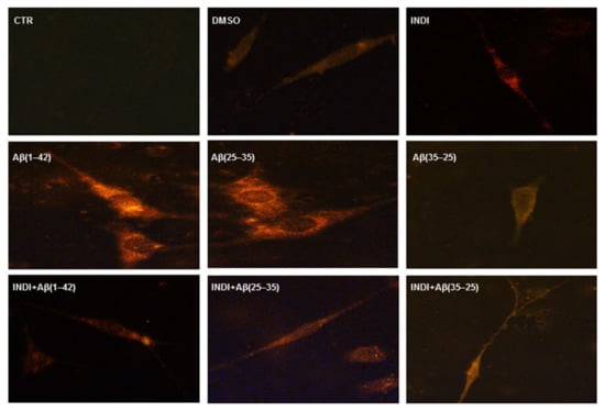 In untreated and treated OECs, 20 μL of 0.5% MTT solution were added to each multiwell as previously reported []. After 2 h of incubation at 37 °C, the supernatant was removed, replaced with 200 μL DMSO, and incubated at 37 °C for 1 h. The optical density of each well sample was measured with a microplate spectrophotometer reader (Titertek Multiskan; Flow Laboratories, Helsinki, Finland) at λ = 570 nm. Based on the MTT test, we chose the optimal concentration of indicaxanthin to treat OECs both in the absence and presence of 10 μM Aβ(1-42), Aβ(25-35) Aβ(25-35), 100 µM for 24 h. To exclude eventual interference of indicaxanthin with the MTT solution, several washes with PBS in the untreated and treated cells both in the absence and presence of indicaxanthin were performed and the absorbance of lysed cells was evaluated at λ = 570 nm. No significant differences between the absorbances at λ = 570 nm in the control and indicaxanthin-treated cells were observed. Cell viability (%) was expressed as a percentage relative to the untreated cell one (PBS; controls), which were assumed as 100% of cell viability.
