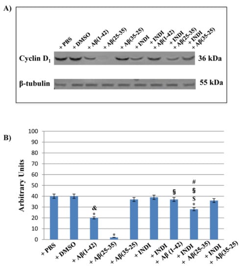 Western blotting analysis. (A) Representative immunoblot through western blotting analysis for cyclin D1 expression levels in total cellular lysates from OECs in different conditions: control, DMSO, 100 µM indicaxanthin, 10 μM Aβ(1-42) or Aβ(25-35) or Aβ(35-25) both in the absence and presence of 100 µM indicaxanthin for 24 h. (B) Densitometric analysis of cyclin d1 expression levels performed after normalization with β-tubulin. The results are expressed as the mean ± S.D. of the values of five separate experiments performed in triplicate. * p < 0.05 significant differences vs. controls. $ p < 0.05 significant differences of Aβ(1-42) + INDI or Aβ(25-35) + INDI or Aβ(35-25) + INDI vs. INDI; § p < 0.05 significant differences of Aβ(1-42) + INDI vs. Aβ(1-42), Aβ(25-35) + INDI vs. Aβ(25-35) or Aβ(35-25) + INDI vs. Aβ(35-25); & p < 0.05 significant differences of Aβ(1-42) vs. Aβ(25-35 ) or vs. Aβ(35-25); # p < 0.05 significant differences of Aβ(25-35) + INDI vs. Aβ(1-42) + INDI or vs. Aβ(35-25) + INDI.
