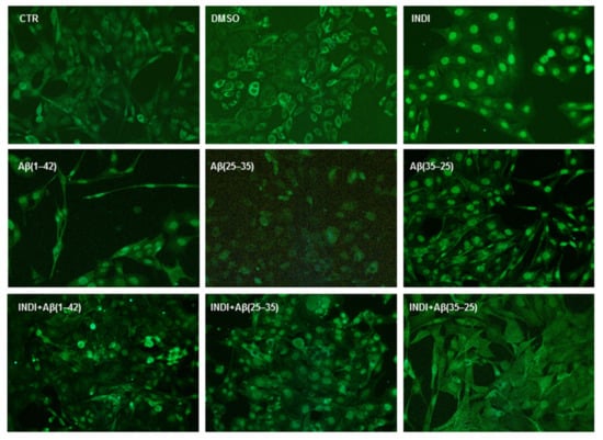 Figure 10 reports the positivity for Nestin in OECs exposed to indicaxanthin in the absence and presence of Aβ(1-42), Aβ(25-35), and Aβ(35-25). A significant reduction in the number of positive cells for Nestin in Aβ(1-42) and Aβ(25-35) exposed was found when compared with the controls. Aβ(35-25) exposed cells showed a slight increase for Nestin positive OECs when compared with the controls. The pre-treatment of cultures with 100 μM of indicaxanthin for 24 h did not induce changes for Nestin positive cells, which appeared similar to the levels observed in the controls. When OECs were pre-treated with 100 μM of indicaxanthin and subsequently exposed to Aβ(1-42) or Aβ(25-35), a strong increase in positive cells for Nestin was found when compared with the controls. A low Nestin positivity in indicaxanthin pre-treated cells and then exposed to Aβ(35-35) was shown. No specific staining of OECs was observed in control incubation in which the primary antibody was omitted.