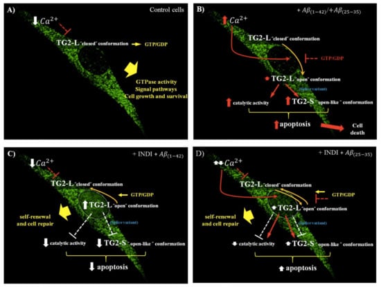 Taken together, our findings demonstrate that Aβ stress is responsible for TG2 upregulation [,] and its structural modifications in two distinct conformational states with different functions []. In fact, when the levels of Ca2+ are low and those of guanosine triphosphate (GTP) or guanosine diphosphate (GDP) are high, TG2-L acts as a GTPase, is involved in signaling pathway, is inactive, and is present in “closed” conformation, promoting cell growth and survival (Figure 11A). Aβ exposure of OECs, increasing intracellular Ca2+ and decreasing GTP or GDP levels, might cause a change of TG2-L from “closed” to “open” conformation, catalytically active. In addition, Aβ treatment induced an increase in the levels of TG2-S, an alternative splice variant of TG2 lacking the portion of the carboxyl-terminal essential for the maintenance of the protein in the “closed” conformation that is responsible for apoptotic activation and cell death. The effect is more evident when the cells were exposed to the major toxic Aβ(25-35) fragment, which strongly enhanced intracellular Ca2+ levels (Figure 11B). Furthermore, the increased expression levels of TG2-S following the exposure of OECs to Aβ(1-42) and Aβ(25-35) were accompanied by the activation of the apoptotic pathway, as revealed by caspase-3 cleavage. The effect was particularly evident with the toxic fragment Aβ(25-35). This finding is in agreement with other observations reporting that TG2-S was found in the brain of AD patients, and it also represents the prevalent isoform responsible of cell death []. Furthermore, the apoptotic activity of TG2-S is related or an excess of transamidanting activity, which possesses a weak ability to bind GTP and is not able to regulate the enzymatic activity of TG2, or to the capacity of TG2-S to lead cell aggregation []. Therefore, Aβ induced cell death in OECs, increasing the expression levels of TG2-S. The effect was also accompanied by the decrease of Nestin and cyclin d1 levels, and it was more evident in Aβ(25-35) exposed OECs, in which cyclin d1 disappears. Indicaxanthin pre-treatment prevented total TG2 overexpression induced by the OEC exposure to the full native peptide Aβ(1-42) and Aβ(25-35) fragment, probably binding to Ca2+ []. The significant increase in TG2-L isoform expression levels induced by Aβ(1-42), accompanied by the decrease in TG2-S ones, is related to the role that the protein plays into the nucleus, in which it might stimulate OEC self-renewal and the reparative effect against Aβ toxicity (Figure 11C). Furthermore, in Aβ(25-35) exposed OECs, indicaxanthin is able to significantly decrease TG2-S isoform expression levels, enhancing at the same time those of TG2-L. This effect was accompanied by the reduction of oxidative stress, caspase-3 cleavage, and in parallel by an increase in both the cyclin D1 and Nestin levels. The different expression pattern of TG2 isoforms in Aβ(25-35) exposed cells in the presence of indicaxanthin might be due to the major toxicity of the fragment, which induces a major enhancement of Ca2+. Thus, in these conditions, the protein was able to stimulate both apoptosis and self-renewal (Figure 11D).