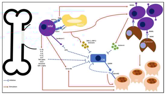 Interestingly, proteasome inhibitors promote OB differentiation independently of Wnt signaling. Thus, they have an anabolic effect on myelomatous bone []. MBD development has a direct correlation with the stimulation of OCs and inhibition of OBs.