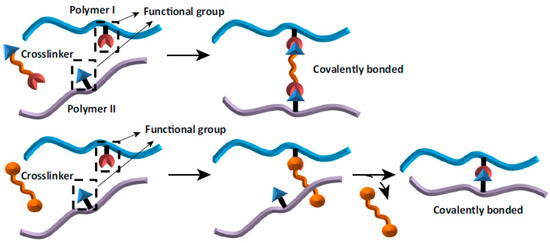 There are three cross-linking methods available: chemical, physical and enzymatic [1,2,6]. The most common is chemical modification [5]. It is the process, where covalently bridged polymeric chains are used to improve polymer properties [2,7]. The scheme of chemical cross-linking is shown in Figure 1.