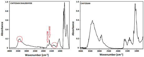 The Fourier transfer infrared spectroscopy with attenuated total reflectance device (FTIR-ATR) spectra of dialdehyde chitosan (DAC) and chitosan (CTS) are presented in Figure 2. The band at 1728 cm−1 in the left part of Figure 2, is characteristic for the aldehyde groups (carbonyl stretching vibrations) which resulted from the periodate mediated oxidation [31]. The intensity of this peak is closely related to the oxidant/chitosan ratio [31]. At 1632 cm−1, a newly formed sharp band can be seen. It derived from carbonyl group and it is a confirmation of chitosan oxidation [29]. By comparison of CTS and DAC spectra, it can be seen that intensity of a peak at 3364 cm−1 (Figure 2), which is responsible for O-H stretching vibrations, is lower for dialdehyde chitosan than for chitosan. It is because the cycling structure of chitosan is opened [27,29]. The intensity of the peaks in the range of 1300–1400 cm−1 (Figure 2) is also lower for dialdehyde chitosan than for chitosan. It shows effective changes of glucoside rings caused by their opening and oxidation. All results are coherent with literature findings [27,29,31,32].