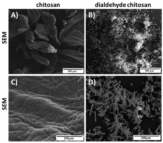 SEM images of chitosan (A,C) and dialdehyde chitosan (B,D).