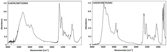 FTIR-ATR spectra of Coll/SF/20CTS scaffold cross-linked by dialdehyde starch (Coll/SF/20CTS/DAS) and dialdehyde chitosan (Coll/SF/20CTS/DAC).