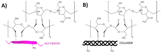 The FTIR-ATR analysis was carried out to detect the formation of characteristic bonds resulting from cross-linking reactions. It was previously discussed that the NH– stretching vibration belongs to the amide A bond, near to 3300 cm−1 [5]. The frequency of vibrations depends on the strength of hydrogen bonds that stabilize the structure. In the prevailing number of articles the amide I, II and III bands were noticed around 1650 cm−1, 1550 cm−1, and 1241 cm−1, respectively [12]. At ~1075 cm−1, C–O stretching vibrations peak provides information about hydrogen bond formation [33]. According to literature [34,35,36], the characteristic absorption peak of imine group, which is the confirmation of cross-linking reaction is present near 1657 cm−1. The Schiff’s base formation occurs between the available aldehyde groups of dialdehyde compound and free amino groups of biopolymer [33,34]. Taking into account different blends based on silk fibroin, collagen and chitosan, there are no significant differences in band locations, but some intensity changes of the bands can be observed. Based on the literature [33,37] the possible mechanisms of cross-linking were proposed, which is shown in Figure 5.
