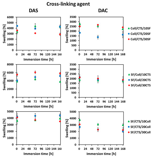 With the aim to mimic the behavior of the scaffold after its implantation into the human body, the swelling ratio was measured. Based on the obtained results, the swelling ratio curves for the studied materials are shown in Figure 6. The measurements were prepared at three several timepoints: 2 h, 72 h (three days), 168 h (seven days). According to literature [38], the materials based on biopolymers (e.g., silk fibroin, collagen, chitosan, hyaluronic acid) are easily wettable by polar solvents such as PBS or simulated body fluid (SBF) due to presence of functional groups capable of binding water [37,38]. The result is the high swelling degree [38]. There are no previously published reports, where three dimensional materials cross-linked by dialdehyde starch and dialdehyde chitosan were compared.