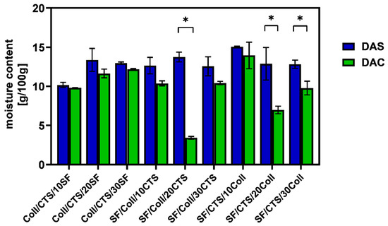 The results of moisture content of the scaffold cross-linked with dialdehyde starch (DAS) and dialdehyde chitosan (DAC). Results are presented as mean ± standard error of the mean (* p ≤ 0.05 between cross-linkers, according to one-way ANOVA with Holm–Sidak post hoc test, GraphPad Prism 8.0.1.244).