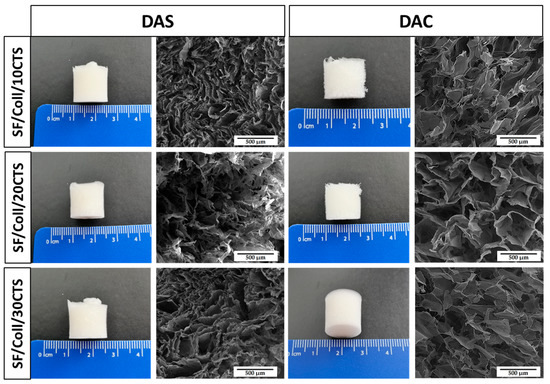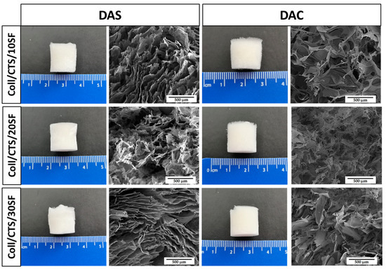 Macroscopic appearance and SEM micrographs of 50/50 SF/Coll scaffolds with 10, 20 and 30% addition of chitosan cross-linked with dialdehyde starch (DAS) and dialdehyde chitosan (DAC).