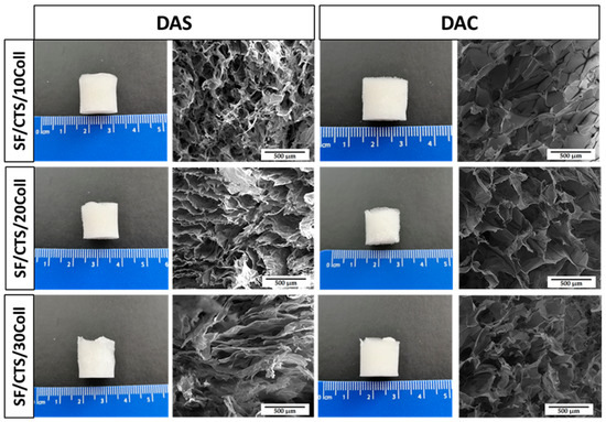 Macroscopic appearance and SEM micrographs of 50/50 SF/CTS scaffolds with 10, 20 and 30% addition of collagen cross-linked with dialdehyde starch (DAS) and dialdehyde chitosan (DAC).