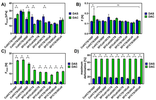 Mechanical parameters of the scaffolds cross-linked with dialdehyde starch (DAS) and dialdehyde chitosan (DAC): (A) Young’s modulus (Emod); (B) force at maximum deformation (F); (C) maximum force (Fmax); (D) maximum deformation. Results are presented as mean ± standard error of the mean (* p ≤ 0.05 between cross-linkers; ns: no significant difference according to one-way ANOVA with Holm–Sidak post hoc test, GraphPad Prism 8.0.1.244).
