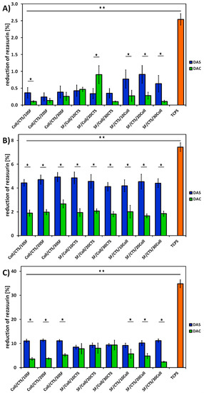 Metabolic activity expressed as reduction of AlamarBlue on days 1 (A), 3 (B), 7 (C) of MG-63 cells cultured on scaffolds cross-liked with dialdehyde starch (DAS) and dialdehyde chitosan (DAC) and on control TCPS (tissue culture polystyrene). Results are presented as mean ± standard error of the mean (* p ≤ 0.05 between cross-linkers; ** p ≤ 0.05 vs. TCPS according to one-way ANOVA with Holm–Sidak post hoc test, GraphPad Prism 8.0.1.244).