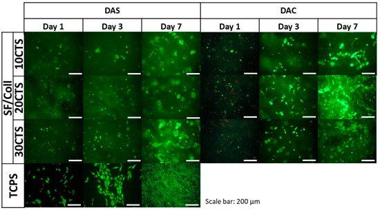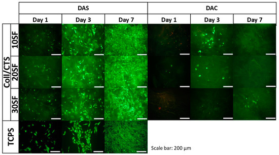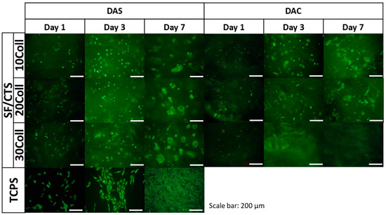 Images of MG-63 cells grown for one, three or seven days on SF/CTS 50/50 mixtures with 10, 20 and 30% addition of Coll, cross-linked with dialdehyde starch (DAS) and dialdehyde chitosan (DAC) scaffolds and on control TCPS. Live/dead staining. Scale bar = 200 μm.