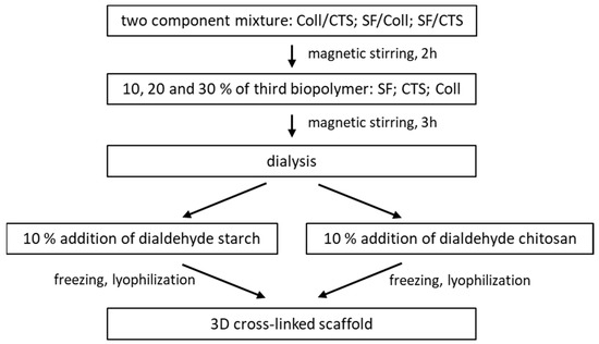 The scheme of scaffold preparation is shown in Figure 16. Two biopolymers (Coll/CTS; SF/Coll; SF/CTS) were mixed together in 50/50 weight ratio with a magnetic stirrer (2 h). The third biopolymer (SF; CTS; Coll) was added in 10, 20 and 30 w/w% amount and mixed (3 h). The mixtures were dialyzed against distilled water (three days) to aqueous solutions. The cross-linking agents: dialdehyde starch, dialdehyde chitosan) were added to obtained mixtures and mixed with a magnetic stirrer (3 h). The mixtures were poured to 24-well plates and frozen (one day, −80 °C) and lyophilized (−55 °C, 5 Pa, 48 h, ALPHA 1–2 LD plus, CHRIST, Osterode am Harz, Germany).