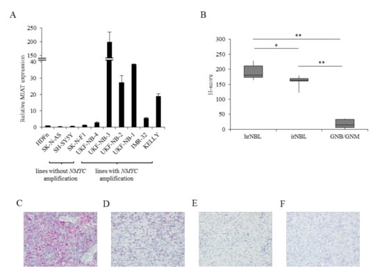 We found a high MIAT expression in the NBL due to the microarray expression experiments in the NBL cell line (data not shown). According to the result, the expression of MIAT was measured in nine NBL cell lines: six lines with NMYC amplification (UKF-NB-4, UKF-NB-3, UKF-NB-2, UKF-NB-1, KELLY, IMR-32) and three without amplification (SK-N-AS, SH-SY5Y, SK-N-F1) [,]. The NMYC status in cell lines UKF-NB-1 and UKF-NB-2 was detected by fluorescence in situ hybridization (FISH) using a dual-color probe (Figure S1). The MIAT expression was also measured in HDFn as representative of non-tumor cells using qRT-PCR (Figure 1). Results show that the MIAT expression is noticeably higher in NBL cells with NMYC amplification than in cell lines without NMYC amplification (p < 0.01). Moreover, the MIAT expression in lines without amplification is lower than that in non-tumor HDFn cells (p < 0.01) (Figure 1A). All NMYC-amplified cell lines have an unequivocally higher NMYC mRNA expression than non-amplified cell lines, as measured by qRT-PCR assay (Figure S2A). To determine whether MIAT is also expressed in tumor tissue and not only in cell lines, we analyzed the MIAT RNA expression using the RNA-ISH method in a total of 21 formalin-fixed paraffin-embedded (FFPE) tissues. We found a significantly higher MIAT positivity in high-risk NBL than in samples of lower risk or benign tumors, such as ganglioneuroma (p < 0.01) (Figure 1B–F). These results in cell lines and tumor tissues demonstrate that lncRNA MIAT is potentially associated with NMYC status (amplification and/or overexpression) in NBL and more expressed in NBL tumor tissues with a higher malignancy. Thus, MIAT can contribute to the malignant behavior of NBL.