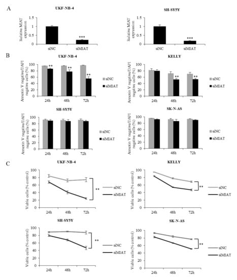 We found that MIAT is connected to NMYC status and is expressed in NBL tissue. Thus, we hypothesized that MIAT could exert a pro-tumorigenic function—namely, in NBL with NMYC amplification. To address this question, we first knocked down MIAT using siRNA in NBL cells. The transfection resulted in a significant suppression of the MIAT level compared to non-coding siRNA-transfected cells (Figure 2A). Cell viability assays at 24, 48, and 72 h after transfection indicated that knockdown MIAT inhibited cell proliferation and reduced the number of viable cells compared to non-coding siRNA transfected cells in all tested cell lines. An annexin V binding assay further demonstrated that MIAT silencing in NBL cells induced apoptosis only in cell lines with NMYC amplification. Interestingly, we found only growth inhibition in NBL cells without NMYC amplification (Figure 2B,C). These data show that MIAT is a significant positive regulator of NBL proliferation and that MIAT silencing markedly induces apoptosis in NMYC-amplified cells.