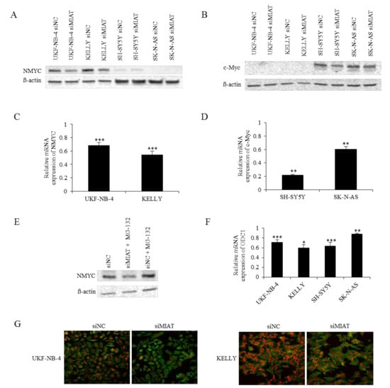 MIAT downregulation reduces NMYC expression in NMYC-amplified cell lines and c-Myc expression in NMYC non-amplified cell lines. (A) The NMYC and (B) c-Myc protein expression; (C) the NMYC, (D) c-Myc, and (F) ODC1 mRNA expression in siNC or siMIAT-transfected neuroblastoma cells. (E) The NMYC expression in siNC or siMIAT-transfected neuroblastoma UKF-NB-4 cells and simultaneous proteasome inhibition. (G) The NMYC expression after MIAT downregulation was also determined by immunofluorescence staining- NMYC- red, actin- green (630× magnification). The image shows representative data of three independent experiments. Values are mean ± SD from three independent experiments. *** p < 0.001, ** p < 0.01, * p < 0.05 as compared to the siMIAT/siNC group (REST 2009).