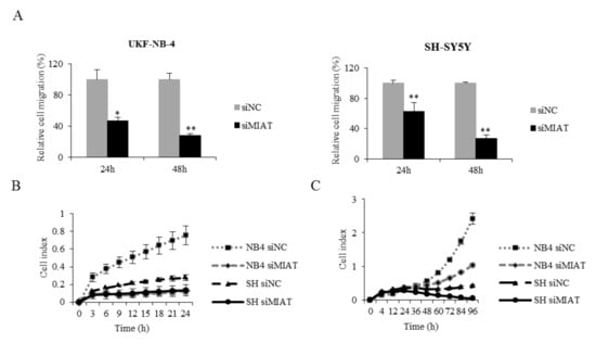 Migration is an important ability of tumor cells and plays a key role in metastasis and cell survival. We performed a wound-healing assay as well as a xCELLigence system measurement. MIAT downregulation significantly reduced UKF-NB-4 and SH-SY5Y cell migration (Figure 5 and Figure S6). These results indicate that MIAT might act as a regulator of the cell cycle and promote the migration of NBL cells.