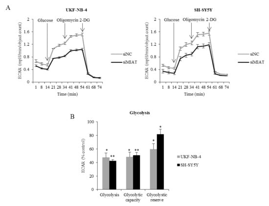 MIAT knockdown decreases glycolytic function. (A) The line graph shows changes in ECAR after the addition of glucose, oligomycin, and 2DG. (B) The histogram shows glycolysis, glycolytic capacity, and glycolytic reserve in MIAT knockdown cells expressed as % of controls in UKF-NB-4 and SH-SY5Y cells. The graph shows representative data of at least three independent experiments. Values are mean ± SD from independent experiments. ** p < 0.01, * p < 0.05 as compared to siMIAT/siNC group (ANOVA with post hoc Tukey HSD Test).