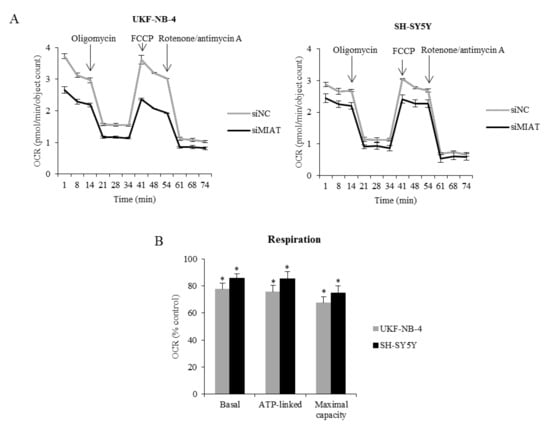 MIAT knockdown decreases respiration. (A) The line graph shows changes in OCR after the addition of oligomycin, FCCP, and rotenone/antimycin A. (B) Histogram shows basal, maximal, and ATP-associated respiration in MIAT knockdown cells expressed as % of controls in UKF-NB-4 and SH-SY5Y cells. The graph shows representative data of at least three independent experiments. Values are mean ± SD from three independent experiments. * p < 0.05 as compared to siMIAT/siNC group (ANOVA with post hoc Tukey HSD Test).