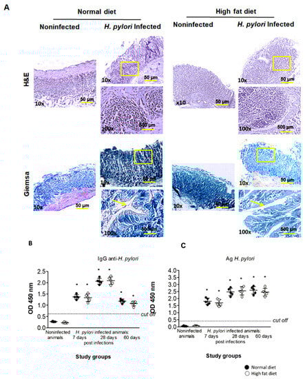 Histological and serological assessment of H. pylori infection in the experimental guinea pig model. (A) Representative images of the Giemsa- and H&E-stained thin layer sections of gastric tissue from uninfected or H. pylori-infected animals after 60 days from inoculation. Uninfected or H. pylori-infected animals were exposed to normal chow (left panel) or an experimental high-fat diet (right panel). Stained sections were analyzed using light microscopy (magnification ×100, ×400). The yellow arrows show the location of Helicobacter-like organisms (HLO). (B) The serum level of anti-H. pylori IgG and (C) the detection of H. pylori antigens (Ag) in stool samples of uninfected and H. pylori-infected guinea pigs after 7, 28 and 60 days from inoculation. Five animals per group were examined. The results are presented as the median values of four independent experiments performed in triplicates for each experimental variant. Statistical analysis was performed with the nonparametric Kruskal–Wallis test. Statistical significance, * p < 0.05, was obtained for H. pylori-infected animals (7, 28 and 60 days after inoculation) fed chow or a high-fat diet vs. the control animal.