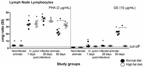 Finally, we detected the H. pylori antigen-driven proliferative response of the lymph node lymphocytes from H. pylori-infected animals exposed to normal chow or a high-fat diet, as described previously [,]. As shown in Figure 2, lymphocytes from animals infected with H. pylori and fed normal chow or a high-fat diet proliferated effectively in response to phytohemagglutinin (PHA), which indicated the increased nonspecific polyclonal activation. Interestingly, lymphocytes isolated from the lymph nodes of infected animals at 60 days of infection, but fed normal chow, proliferated very effectively towards H. pylori glycine extract (GE), suggesting development of an antigen-specific local response (Figure 2). On the other hand, the exposure of infected animals to a high-fat diet caused inhibition of lymph node lymphocyte antigen-specific proliferation, as shown in Figure 2. Our results suggest that introducing infected animals to a high-fat diet led to lymph node lymphocyte unresponsiveness to stimulation with H. pylori antigens. Thus, lymphocytes showed insensitivity to H. pylori antigens even though these bacteria were still detectable in the gastric tissue of infected animals (Table 1, Figure 1A,C).