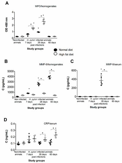 We evaluated the level of myeloperoxidase (MPO) and metalloproteinase (MMP)-9 in the gastric tissue of animals of all groups. Both are recognized markers of oxidative stress and inflammatory response and were shown previously by Gonciarz et al. 2019 [] to be elevated in gastric tissue of H. pylori-infected guinea pigs. Our results presented in Figure 3A indicate that the concentration of MPO in gastric homogenates of infected animals reached the maximum at 28 days of infection, but it was on the level of control at 60 days from inoculation. Interestingly, the exposure of infected animals to high-fat diet raised the MPO level almost two times (Figure 3A). We also measured the level of MMP-9 in gastric tissue and serum of animals of all groups. The data shown in Figure 3B indicate that the concentration of MMP-9 in gastric tissue continuously increased over time of H. pylori infection; thus, at 60 days from inoculation, it was almost two times higher than at 28 days. Interestingly, the exposure of infected animals to the experimental high-fat diet caused significant downregulation of MMP-9 release, so the concentration of this enzyme at each time point reached the level of the control. Similar results were obtained for the MMP-9 in the serum of animals of all groups. As shown in Figure 3B, MMP-9 was measurable only in the group of H. pylori-infected animals fed normal chow at 28 days from inoculation.