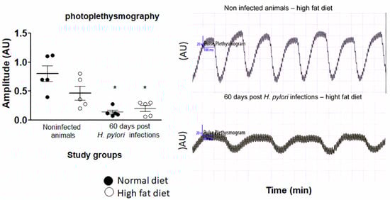 Photoplethysmography analysis of the arteries of uninfected and H. pylori-infected animals, at 60 days from inoculation, exposed to normal chow or an experimental high-fat diet. Five animals per group were examined. The results are presented as the mean values of the amplitudes (AU) ± SD. Statistical analysis was performed with the nonparametric Kruskal–Wallis test. Statistical significance, * p < 0.05, was obtained for H. pylori-infected animals vs. the control animals.