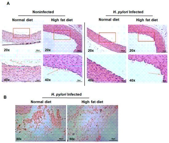 Histological analysis of aortic structure of uninfected and H. pylori-infected animals, at 60 days from inoculation, exposed to normal chow or an experimental high-fat diet. Representative images of H&E-stained thin layers of aortic tissue, visualizing (A) the aortic wall layers or (B) the aortic lumen. Stained sections were analyzed with light microscopy at magnifications of 200× and 400×. The red arrows show the location of the immunocompetent cells and erythrocytes in the nearest proximity to the aortic wall (A) or leukocyte cells in the lumen of the aorta (B). Five animals per group were examined.