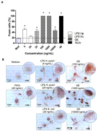 Human monocyte leukemic cell line (THP-1) was purchased from (ATCC, UK). Nonadherent cells were cultured in RPMI-1640 medium supplemented with 10% heat-inactivated FBS (Biowest, France), 2 mM l-glutamine and 100 U/mL streptomycin-penicillin (Biowest, France) at 37 °C with 5% CO2. Foam cell formation assay was conducted as described by Khan et al. (2014) []. Briefly, THP-1 cells plated at 3 × 105 cells/well on glass coverslips (placed in 12 well plate) were differentiated into macrophages with 50 nM phorbol-12- myristate-13-acetate (PMA; Sigma-Aldrich) for 72 h at 37 °C with 5% CO2. After 72 h, the adherent macrophages were exposed to H. pylori GE (10 ug/mL, 1 ug/mL, 0.1 ug/mL), H. pylori LPS (25 ng/mL and 5 ng/mL), LPS E. coli (25 ng/mL) and 7-KCh (conc. 40 ng/mL) for 24 h at 37 °C with 5% CO2. After 24 h, the cells were fixed with 4% paraformaldehyde in PBS for 15 min, and covered with Oil Red O (Sigma) at a working solution (0.6% (m/v) in a 60% (v/v) isopropanol solution for 30 min. Next, the cells were counterstained with a hematoxylin solution (Elektro Med, Niepolomice, Poland) for 3 min. Stained cells were visualized with light microscopy (Eclipse 50i, Nikon; 1000× magnification) with a photo camera, a Power Shot A 640 (Canon), integrated. Lipid droplets appeared red and nuclei appeared blue.