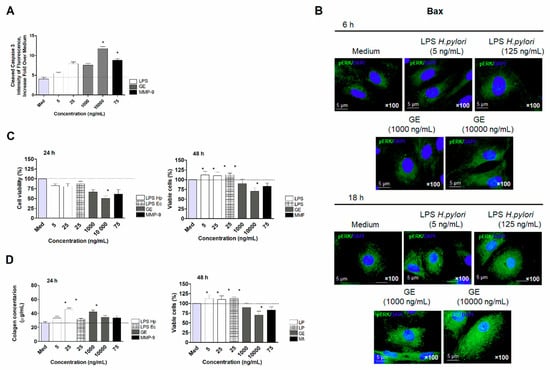 Detection of apoptosis intensity in vascular endothelial cells treated with H. pylori antigenic components: (GE) and lipopolysaccharide (LPS) or metalloproteinase (MMP)-9. (A) Cleavage of Caspase 3, presented as the intensity of the fluorescence fold increase across mediums. (B) Representative pictures of the expression of proapoptotic protein Bax in vascular endothelial cells analyzed with fluorescent microscopy at a 1000× magnification. (C) Endothelial cell viability tested in an MTT reduction assay. Results are presented as the average percentage of cells (control and stimulated with H. pylori antigens). (D) The concentration of Collagen I in culture media of vascular endothelial cells (control or stimulated with H. pylori antigens). Data represent the average values of four independent experiments performed in triplicates for each experimental variant. Statistical analysis was performed using the nonparametric Mann–Whitney U test with significance for * p < 0.05 obtained for unstimulated cells vs. cells treated with stimulators.