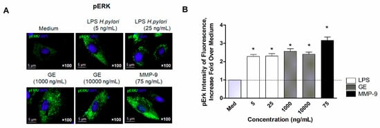 Analysis of ERK activation/phosphorylation (pERK) in vascular endothelial cells. (A) Representative pictures of pERK in endothelial cells unstimulated or treated with H. pylori antigenic components: glycine acid extract (GE), lipopolysaccharide (LPS) or metalloproteinase (MMP)-9 analyzed with fluorescent microscopy at magnification 1000×. (B) pERK expression, presented as the intensity of the fluorescence fold increase over the mediums. A minimum of 100 cells were analyzed. Statistical analysis was performed in the nonparametric U Mann-Whitney test with significance for * p < 0.05 obtained for unstimulated cells vs cells treated with stimulators.