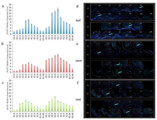 In stems, the expression level of AhATL1 in D1 increased remarkably at 4 h, while that in D2 increased at 1 h. During the process of R1, the expression level of AhATL1 increased slightly at 1–2 h and then decreased gradually; R2 increased at 4 h and then decreased gradually (Figure 1b). For the AhATL1 distribution level, those in the vascular tissue of the phloem of the stems of the D1 and D2 processes were increased gradually at 2 h. At the R1 and R2 stages of rehydration, the overall distribution level of AhATL1 was low. Among them, the AhATL1 distribution level was increased a little at 1–2 h, and then gradually decreased in R1 (Figure 1e), while the AhATL1 distribution level was increased at first (to 4 h).