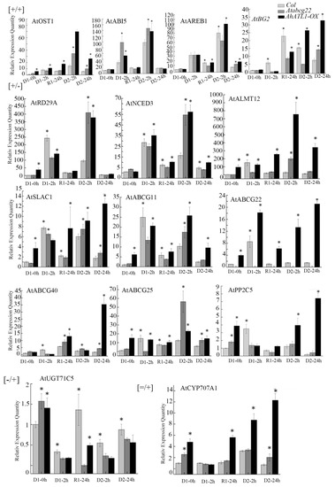 [+/+], [+/−], [−/+], and [=/+] indicate the expression patterns of each gene in wild-type Col. ‘*’ Indicates a significant difference between AhATL1-OX, atabcg22, and Col plants under the same dehydration and rehydration treatment conditions (p < 0.05). Asterisks indicate significant differences from Col in D1 0h (Student’s t test p values, * p < 0.05).