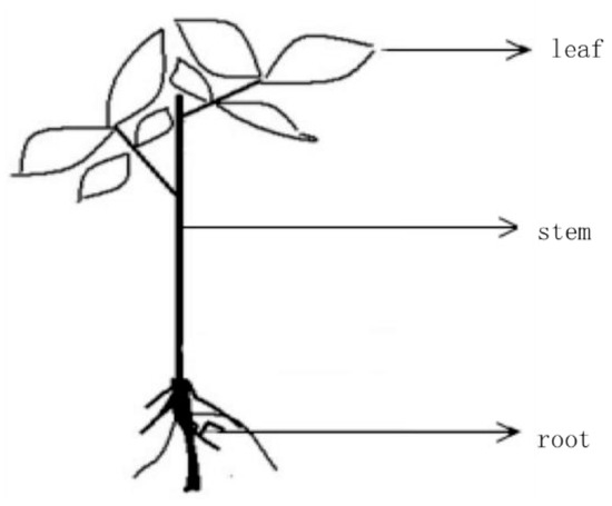 Peanut cultivar ‘Yueyou 7′, which is a drought-resistant variety, was provided by the Crop Research Institute, Guangdong Academy of Agricultural Sciences. Put the peanuts (in a drying basin) in a light incubator (GuangQi, GHP-160, Shanghai, China) to dehydrate (28 °C, 48% RH, with a 16 h light and 8 h dark cycle, Light intensity13,000 lx) and treated for 1, 2, 4, 8, and 24 h in the light. At each sampling point, samples (0.5 g) of leaf (first functional leaf), stem (middle of the stem) and root (taproot, 1 cm) were excised as sample (Figure 5).