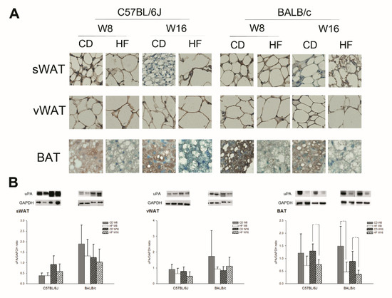 In the present study, in different strains of HFD mice, we found different presentations of dysmetabolic profiles. Serum uPA levels initially increased and then declined with time in both C57BL/6J and BALB/c mice fed a HFD. In both C57BL/6J and BALB/c mice, the expression of uPA in BAT significantly declined after feeding a HFD. However, with a CD and a HFD, uPA expression was similar in the liver, kidney and WAT in both strains of mice. In HFD mice, uPAR expression in BAT and WAT showed no significant change.