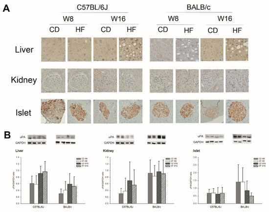 The (A) immunohistochemical stain and (B) Western blot for uPA expression on liver, kidney and islet tissue in C57BL/6J and BALB/c mice (n = 5, in each group). In the CD and HFD groups in both strains of mice, the uPA expression in the liver, kidney, and islet did not differ significantly. All figures of IHC stain: 400×.