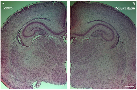 Histological architecture of the newborn rat brain. No differences were observed in paraffin-embedded, H&E-stained tissue sections of control (A) and rosuvastatin (RST)-treated newborn (B) brains by light microscopy. Scale bar: 1 mm.