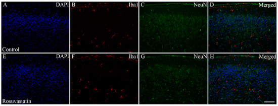 Double immunofluorescent staining for Iba1 and NeuN. Microglia were labeled with the anti-Iba1 antibody/Alexa Fluor 568 goat anti-rabbit IgG complex (red), whereas neurons were detected with the anti-NeuN antibody/Alexa Fluor 488 goat anti-mouse IgG complex (green). Cell nuclei were labeled with DAPI (blue). Representative pictures with lower (20×) magnification show that prenatal exposure to RST did not cause abnormalities in the cytoarchitecture by light microscopy. The ratio of microglia (B,F) to neurons (C,G) is similar between the control (A–D) and RST-treated (E–H) newborn brains. Scale bar: 100 µm.