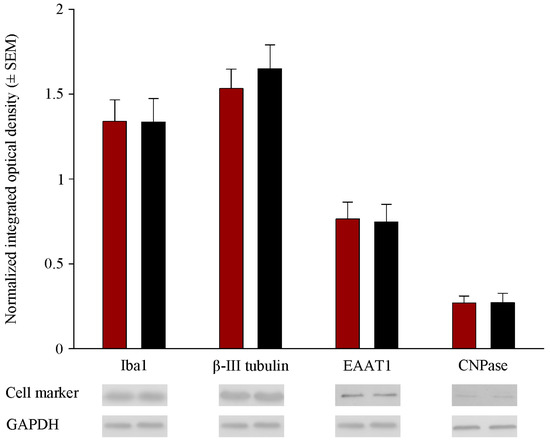 Quantitative Western blot analyses of the main cell types from control and RST-treated newborn rat brains. Controls (red column) and RST-treated (black column) samples were analyzed quantitatively on Western blots for microglial, neuronal, astrocyte, and oligodendrocyte markers. Protein samples (15–30 μg) were separated by gel electrophoresis, transferred to nitrocellulose membranes, and assayed for reactivity toward the Iba1 (microglia marker), beta III tubulin (neuron-specific marker), EAAT1 (astrocyte marker), CNPase (oligodendrocyte marker), and GAPDH proteins. Error bars indicate integrated optical density values (means ± SEM from at least 5 separate experiments) normalized to the values of the internal standard GAPDH. Representative Western blot pictures are shown below the graphs. No statistically significant differences were found between the control and the RST-treated groups.