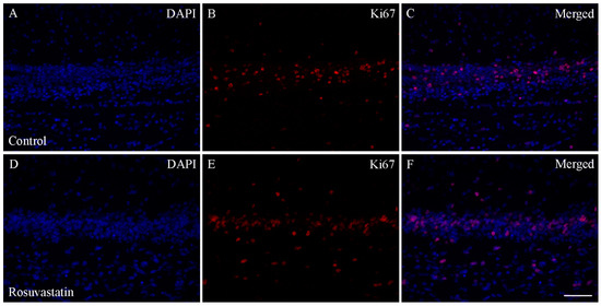 Ki67 immunohistochemistry of the hippocampus in control and prenatally RST-exposed newborn rats. The expression of the Ki67 protein in the tissue areas was quantified by the percentage of Ki67-positive nuclei (red) over the total number of nuclei (positive and negative nuclei). Immunohistochemical data analysis detected highly similar incidences for Ki67-immunopositive cells (B,E) among the DAPI dye-labeled cell nuclei (blue; A,D) for both the controls (12.9%) and the prenatally RST-treated rats (12.5%). Merged pictures (C,F) are shown. Scale bar: 50 µm.