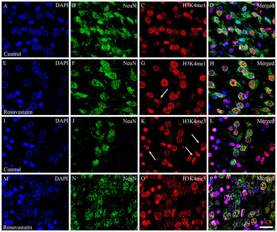 Laser confocal microscopy images of H3K4me1 and H3K4me3 immunoreactivities in neuronal nuclei. Paraffin sections of brains from the control (A–D,I–L) and RST-treated newborn rats (E–H,M–P) were immunostained for NeuN (shown here in green) and H3K4me1 or H3K4me3 (shown here in red), then visualized by confocal microscopy. Cell nuclei were labeled with DAPI (blue). Note the overwhelmingly neuronal localization of the histone methylation marks. Some NeuN-negative non-neuronal cells, notably in panels (G,K) (white arrows), also display H3K4me1 and H3K4me3 marks. Scale bar: 20 μm.