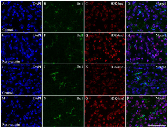 Colocalization of H3K4 methylation patterns and Iba1 immunoreactivity in the microglial cells of the newborn brain. In a newborn rat brain, the majority of the cells are neurons. At birth, microglia are unevenly distributed and located in specific “hotspots” such as the ventricular zone. Due to their overwhelmingly neuronal localization, H3K4me1 and H3K4me3 immunoreactivities (shown here in red) were more intense in the sections cut from the RST-treated newborns (E–H,M–P) as compared to the controls (A–D,I–L). A few H3K4 methylated cell nuclei belonged to Iba1-positive microglia (shown here in green). DAPI-labeled nuclei are shown in blue (A,E,I,M). Scale: 75 μm.