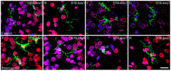 Laser confocal microscopy images of H3K4me1 and H3K4me3 immunoreactivities in microglial nuclei. Newborn brain sections from the control (A–D) and RST-treated rats (E–H) were immunostained for Iba1 (green), and H3K4me1 or H3K4me3 (red), then visualized by confocal microscopy. DAPI-labeled cell nuclei are blue. Note in the merged pictures the very few microglia that colocalize with the histone methylation marks. Scale bar: 20 μm.