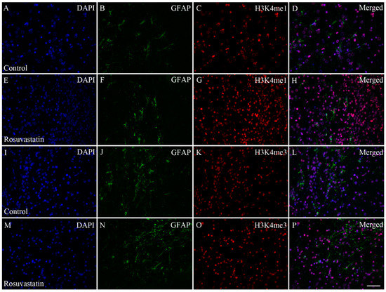 Double immunofluorescence staining for H3K4me1 and H3K4me3 in GFAP-positive astrocytes. In the neonatal rat brains, GFAP-positive cells were few, and unevenly distributed (green; B,F,J,N). DAPI-labeled cell nuclei are blue (A,E,I,M), and H3K4me1 (C,G) and H3K4me3 (K,O) marks are shown here in red. Merged pictures show (D,H,L,P) that few GFAP-positive astrocytes exhibited H3K4me1 and H3K4me3 marks. Scale bar: 50 μm.