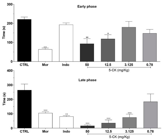 Effects of the systemic treatment with 5-CK in the early and late phases of the formalin test. Mice were treated with 5-CK (50–0.78 mg/Kg) or vehicle (CTRL, 50% propylene glycol in saline; control group) by intraperitoneal (ip.) route 40 min before formalin (injected at time zero). Morphine (Mor; 5 mg/Kg, ip.) and indomethacin (Indo; 10 mg/Kg, ip.) were used as reference drugs. Data are expressed as means ± SEM; n = 6 mice per group. * Significantly different from the control group (p < 0.05). ** Significantly different from the control group (p < 0.01). *** Significantly different from the control group (p < 0.001) as determined by ANOVA followed by Tukey’s test.