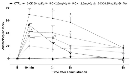 Antinociceptive effect of 5-CK on the cold plate test. Mice were treated by intraperitoneal route 40 min before the test. For the dose−response analysis, the effects of increasing doses (6.25 to 50 mg/Kg) were tested. To evaluate the time-course of the antinociceptive effect, the thermal nociceptive threshold was measured before (B) and up to 24 h following administration of 5-CK, vehicle (CRTL, 50% propylene glycol in saline; control group) or morphine (Mor; 5 mg/Kg), the reference drug. Data are expressed as mean times ± SEM; n = 6 mice per group. $ Significantly different from morphine group (p < 0.001). % Significantly different from 5-CK 50mg/Kg group (p < 0.05). * Significantly different from the control group (p < 0.05). ** Significantly different from the control group (p < 0.01). *** Significantly different from the control group (p < 0.001). Two-way ANOVA followed by Bonferroni’s test.