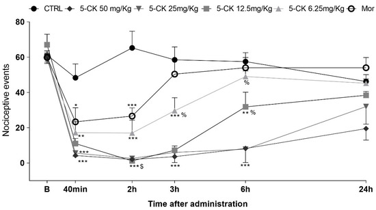 The administration of 5-CK also reduced the nociceptive behavior of mice in the cold plate test in a consistent, dose-dependent, and long-lasting manner (Figure 3). The pretreatment with 5-CK decreased the number of nociceptive events at all tested doses (6.25−50 mg/Kg; p < 0.01). This antinociceptive effect was dose-dependent starting 40 min after the administration of 5-CK. The doses of 50, 25 and 12.5 mg/Kg kept their effects up to 6 h after the administration. As expected, the gold standard morphine (5 mg/Kg, ip.) decreased the number of nociceptive events for up to 2 h (p < 0.001) after administration. In accordance with the tail flick test, the antinociceptive effect of 5-CK was longer-lasting and more efficacious than the one induced by morphine (2 h; p < 0.001). Taken together, these results corroborate the data from the formalin test and indicate that the antinociceptive effect of 5-CK is, at least in part, centrally mediated.