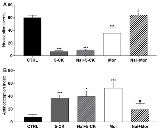 Effect of the pharmacological blockade of opioid receptors on the 5-CK-induced antinociception. Antagonism assays were performed on cold plate; and (A) tail flick; (B) tests with naloxone (Nal, 5 mg/Kg), a non-selective antagonist of opioid receptors. Naloxone was administered by intraperitoneal route (ip) 15 min before the administration of 5-CK (50 mg/Kg, ip) or morphine (Mor; 5 mg/Kg, ip). Data are expressed as means ± SEM; n = 6 mice per group. # Significantly different from Mor group (p < 0.05) * Significantly different from the control group (p < 0.05). *** Significantly different from the control group (p < 0.001). One-way ANOVA followed by Tukey’s test.